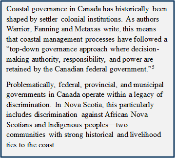 Authority over coastal areas can be a complex arena given the diversity of coastal stakeholders. In Nova Scotia, the existing coastal authority has failed to produce solutions to the various conflicts arising in coastal areas, sometimes to the exclusion of alternative, local visions for coastal management. This has called into question who should really be responsible for coastal governance, and which alternative governance models might be viable in Nova Scotia. Should it be the federal, provincial, and municipal governments? Should coastal policy-making be top-down, or should it foreground local communities and stakeholders voices? And, in a province which is officially and recognizably located on the ancestral and unceded territory of the Mi’kmaq people, how do we ensure Indigenous peoples have a meaningful role in such coastal conversations? i